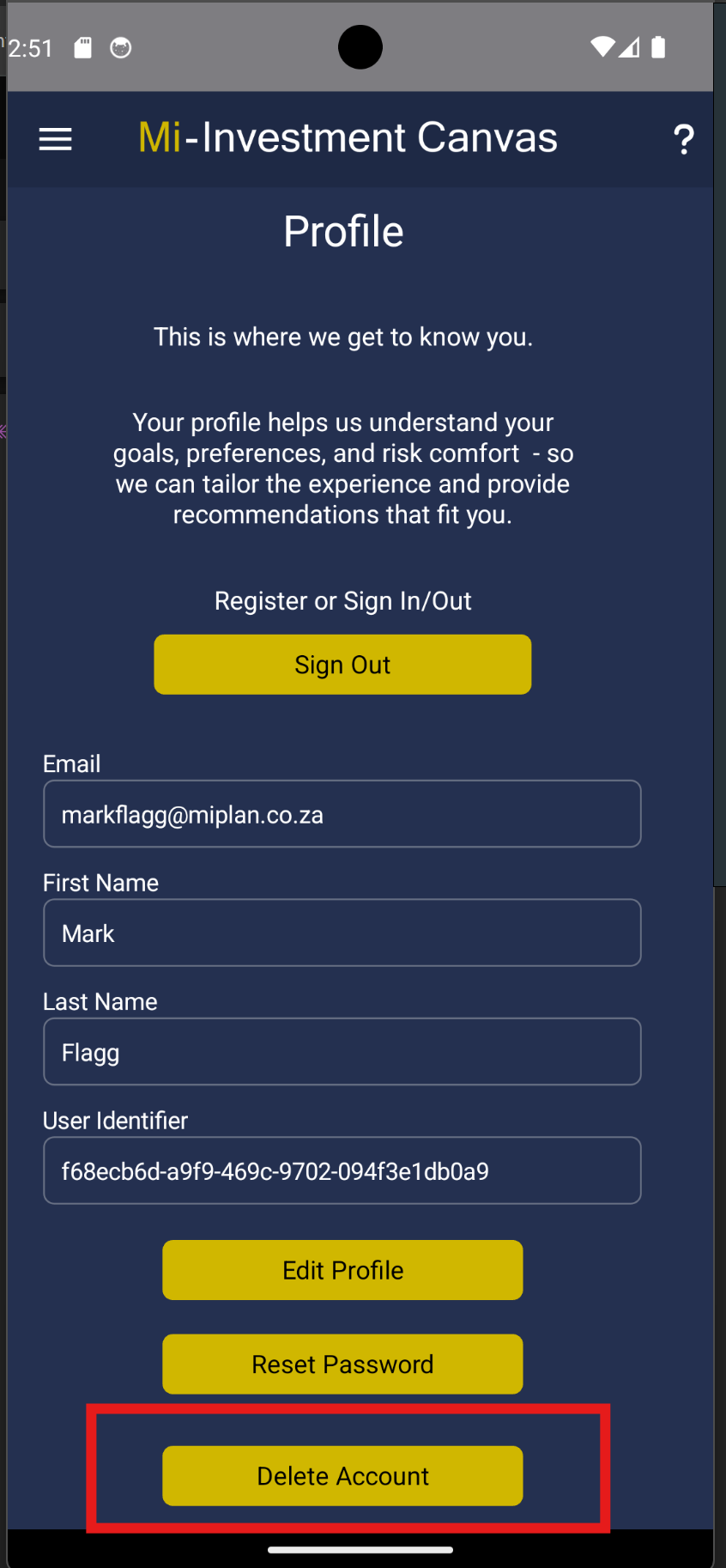 This guide shows you how to delete your profile and all data from Mi-Investment Canvas.